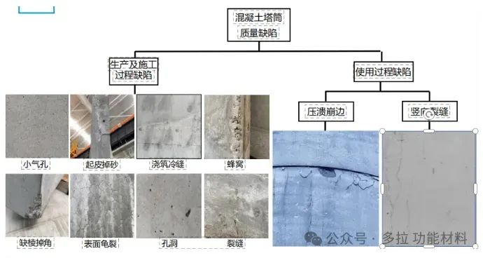 混凝土塔筒的质量缺陷不仅包括生产及施工过程中的小气孔、起皮掉砂等,些看似“不影响承载力”的缺陷,实则是耐久性的“隐形杀手”,一旦雨水渗入,将加速钢筋锈蚀,缩短混塔使用寿命。