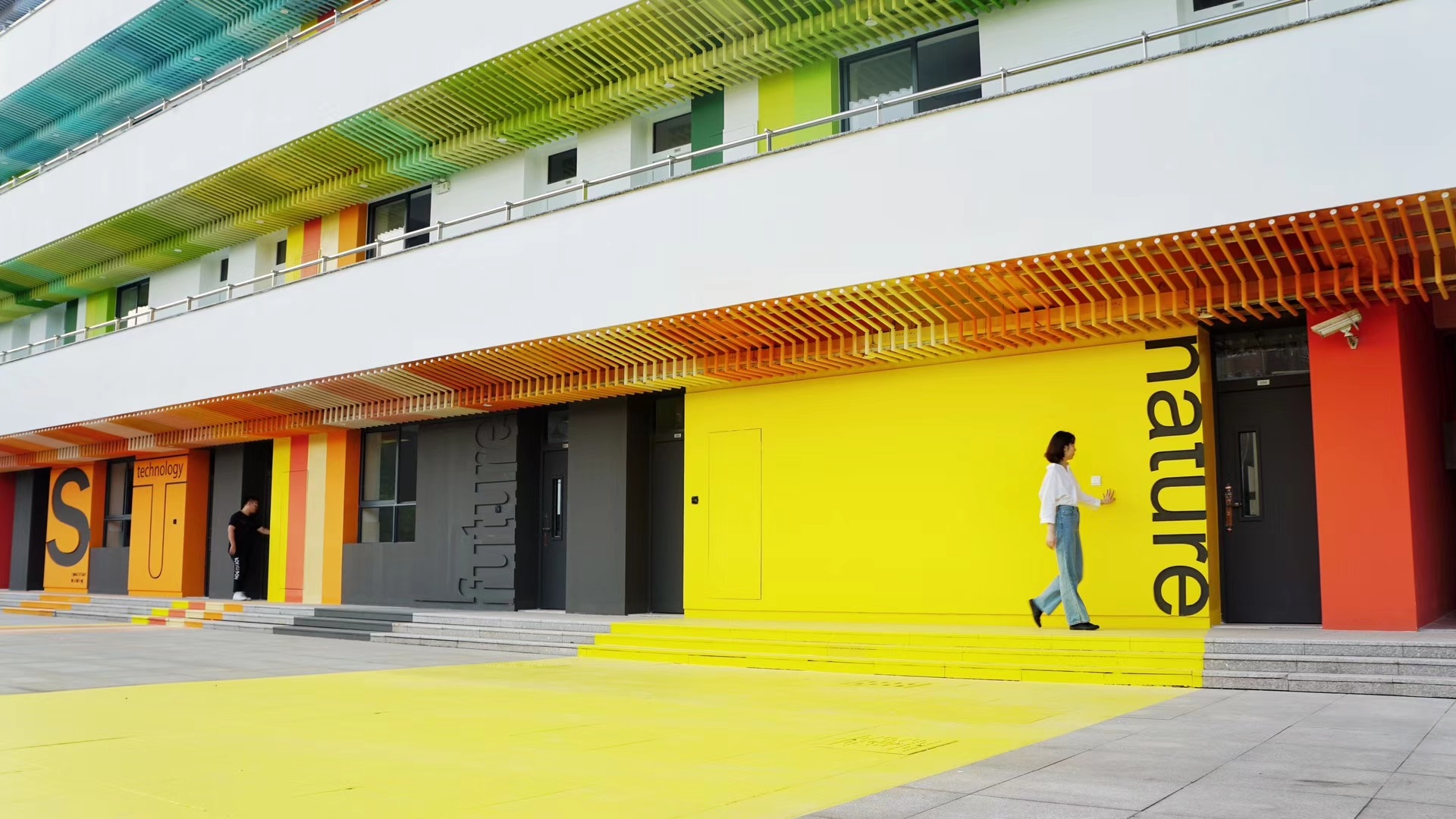 而走廊的横向线条与挑檐部分则大胆融入了丰富的彩色元素,从左至右依次点缀着清新的绿色、明快的黄色、温暖的橙色等,这些跳跃的色彩如同彩虹般勾勒出建筑的轮廓,打破了白色的单调,赋予建筑活泼灵动的气息,让整个建筑在阳光下焕发出蓬勃的生命力,让每一次驻足都能感受到活力与暖意,为接下来的学习与工作注入满满元气。